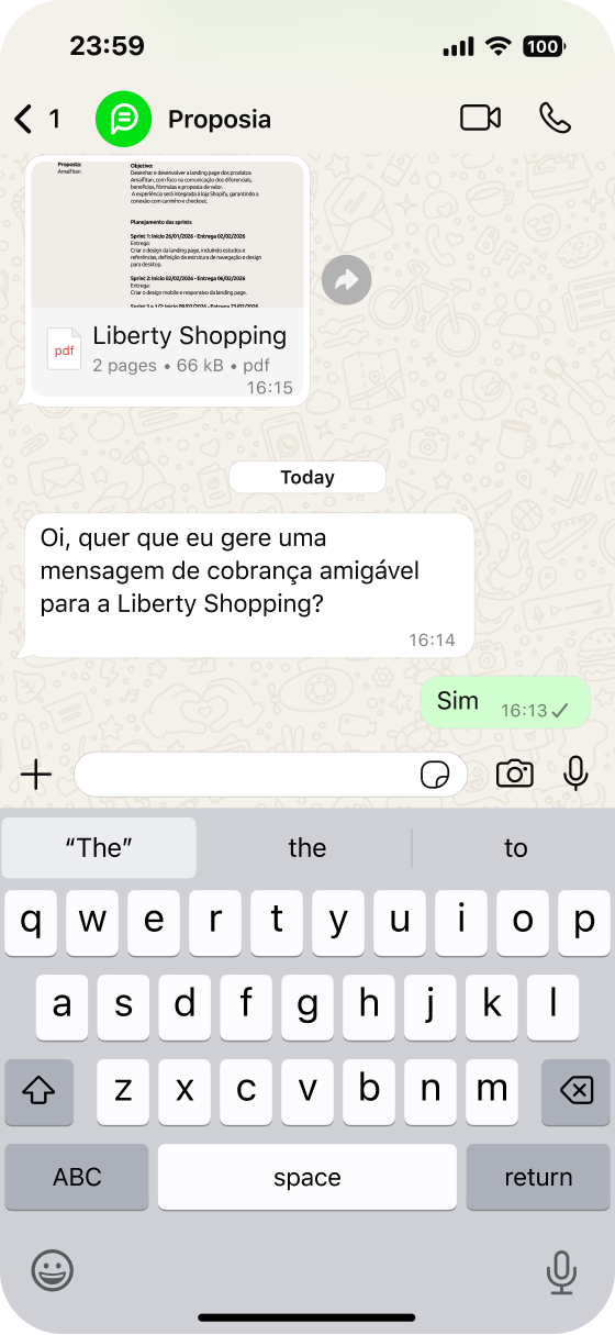 Enviou a proposta e o cliente sumiu? Alguns dias depois, nosso agente te chama proativamente no Zap: "Oi, quer que eu gere uma mensagem de cobrança amigável?".