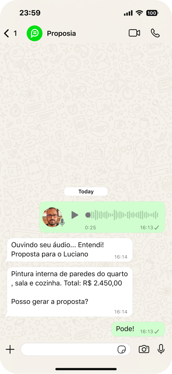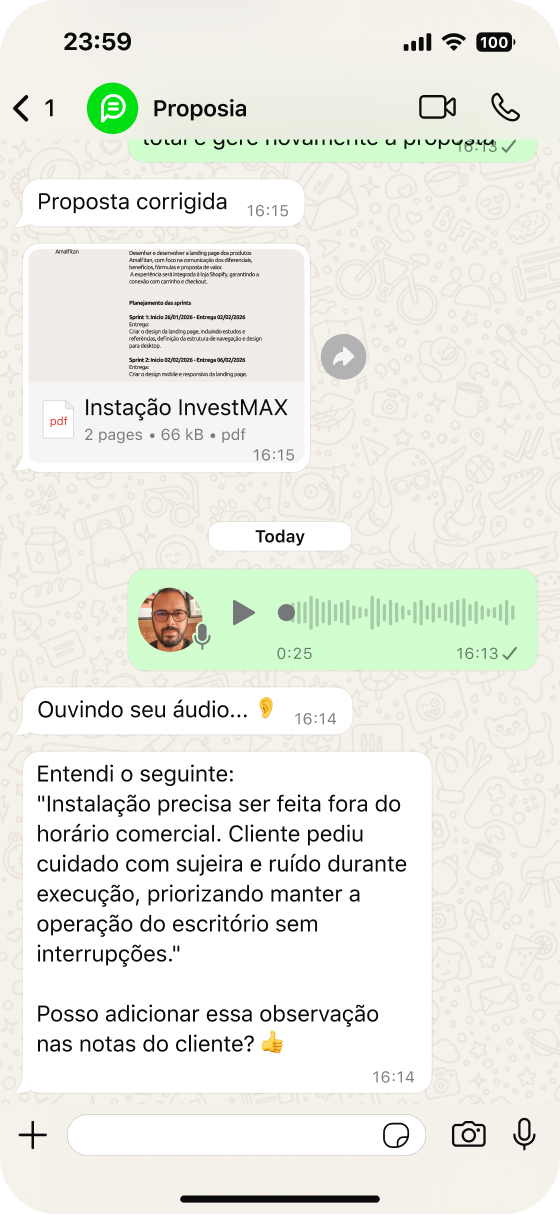 No WhatsApp, você manda um áudio, uma foto ou digita rápido. A IA transforma em PDF no seu timbrado, corrige o português, organiza no funil e ainda te lembra de retomar o contato com o cliente. Menos trabalho, mais vendas.