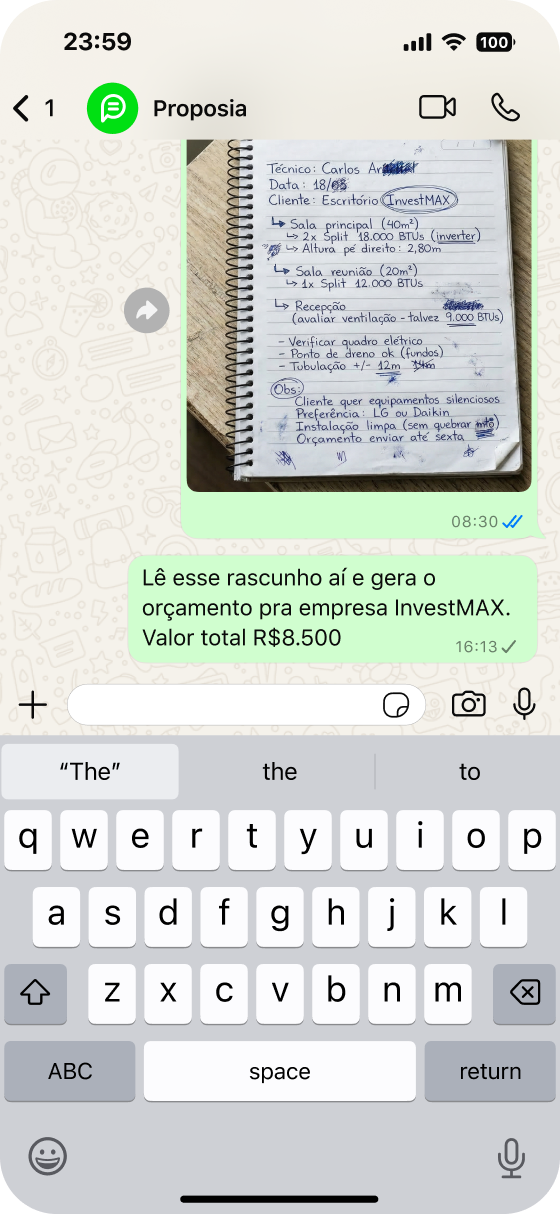 Rabiscou no cliente? Tire uma Foto: Anotou correndo no papel? Tire uma foto, mande no Zap e a IA lê sua letra, transformando o rascunho em proposta oficial.